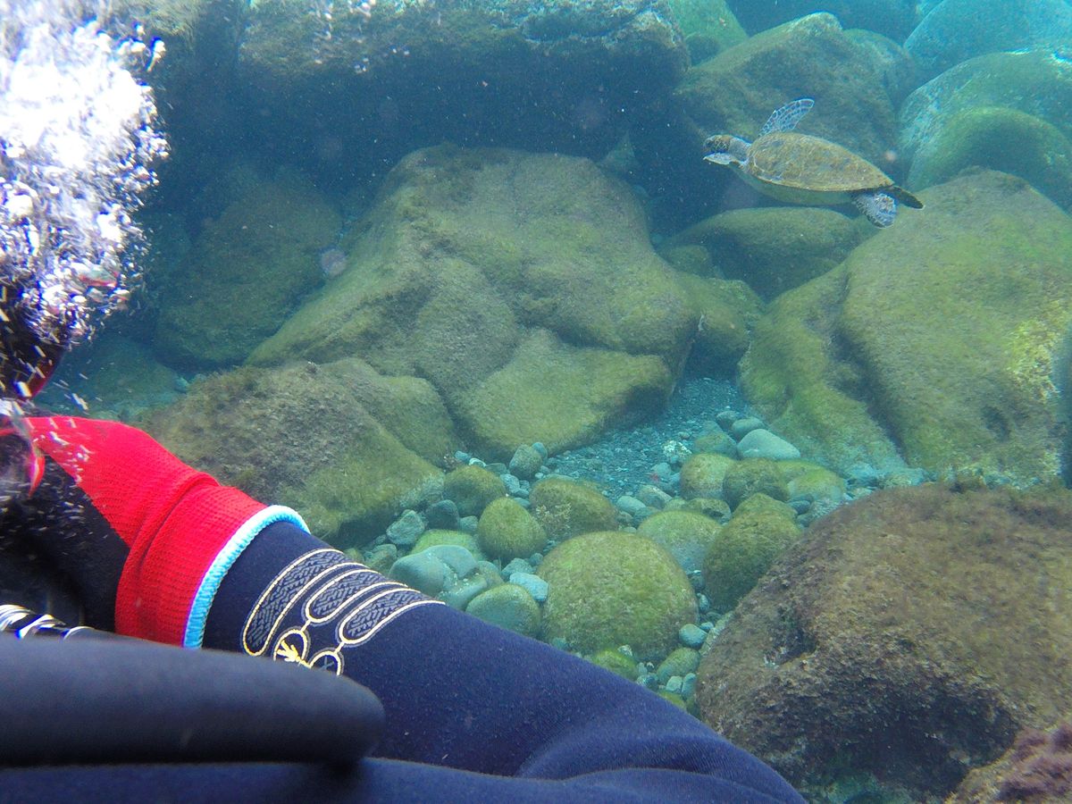 機材一式をお借りする訳ですから、より一層レベルの高い感染対策を求められました。ですが、それが安心につながります。全くの未経験者なのですが、事前レクチャーで全てを覚えることはできません。そこで、「この3つだけは」と重要なポイントを限定して頭の中で理解してー。そんなに簡単に覚えることはできません。一応、言葉で理解し、実際にはインストラクターさんが全てサポートしてくださって、決して無理せず安全を確認しながら潜水でした。海中の様子を自分で撮影できるよう器具のレンタルもあるのですが、ウミガメさんの登場にカメラを受け取っていただいてカメさんと一緒に泳ぐ姿を撮影していただきました。