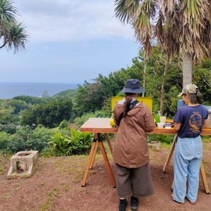 そしてメインのカカオニブと島レモンのジャム作りの場所が驚きで、母島の空と海の絶景を望みながらのサイコーの青空キッチンでした。作りたてのジャムやカカオニブに合う飲み物やクラッカー、なんとアイスクリームまで頂けて幸せなひとときを過ごすことができました。