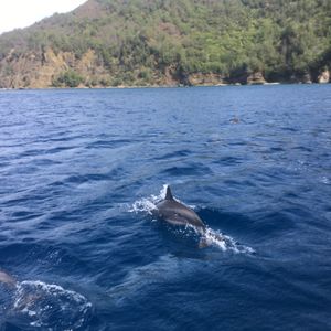 宿まで迎えに来ていただき、港に着いたら船に乗って出発!クーラーボックスも用意してくれているので、お昼ご飯も安心、飲み物も冷たいまま飲めました。海に出てすぐ一緒に泳げるイルカが居るとの事で、大急ぎでウェットスーツを来て、シュノーケルを着けて海に入ってイルカと泳ぐことができました!泳ぎに不安のある私ですが、ウェットスーツは浮力があるので安心です。シュノーケリングが初めての方も居ましたが、インストラクターさんが一緒に入って支えてあげていたので安心して海に入れると思います。その後もイルカを見つけては海に入って泳いだり、船から見たり。みんなで海を泳ぐイルカの背びれを探して、あそこだー!って騒ぐのも楽しかったです笑