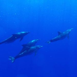 この日はなかなかイルカに逢えなかったのですが、最後にミナミハンドウイルカ四頭の群れと遭遇。どこまでも深い青の世界をイルカと泳げるひと時は本当に貴重な時間。イルカが去った後の海の青さも本当に印象的。またハシナガイルカの大群とも出会え、船上から優雅な泳ぎを堪能できました。