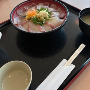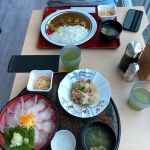 ・桜島フェリーのうどんをとるか、桜島道の駅でのレストラン食をとるか。レストランは養殖ブリはカンパチの海鮮丼か豚カレーかお子様メニュー(うどんなど)