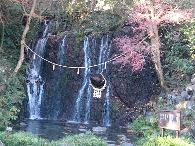 天成園の開館時間に合わせ、箱根9時発のロマンスカーに乗りました。ロマンスカーの座席はゆったりしていて、とても快適。約1時間半ほどで箱根湯本に到着します。駅からは巡回バス(100円)もありますが、散策をかねてゆったり15分ほど歩くと天成園に着きます。まずは敷地内庭園にあるパワースポット「玉簾の滝」、そして縁結びのご利益がある「玉簾神社」に行きました。 庭園の池には金⁉︎や銀⁈のコイがいて、ステキなことが起こりそうな予感。