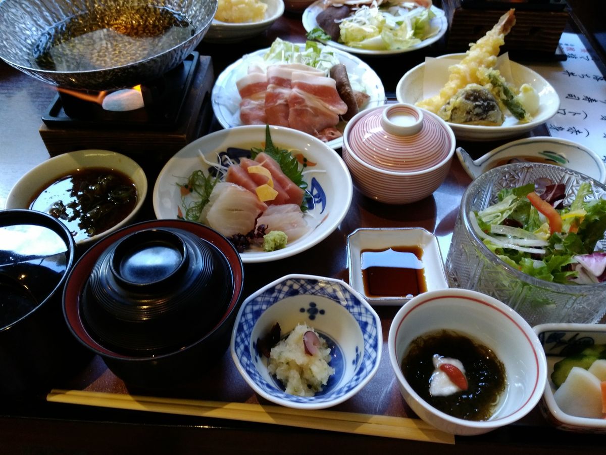 さて、館内に入り受付で館内着である浴衣を選びます。そしてハンドタオルとバスタオルをいただき、いざ入浴。屋上天空大露天風呂は周りの山や鳥の姿が見え、開放感がありとても快適。寝湯や源泉風呂でくつろぎます。お昼ご飯は、混む前にと早めに向かいました。出てきたのは、すくも御膳(2,200円)。熱いものは熱く出てくるのでおいしかったです。食後、もう一度お風呂に入り、リラックスルームで一休み。 16時過ぎに、天成園を後にし食べ歩きをしながら駅へと向かいました。今は日没が早いので、庭園のイルミネーションも見ることもできラッキー。日帰りは時間が短いかなと思っていましたが、とてもリフレッシュできました。
