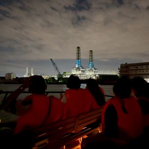 1時間前に受付に行くと、すでに並んでいました。そのまま受付まで待ち、受付後、再集合時間まで自由。受付番号順に乗船。夜風に吹かれながら工場夜景が見えるところまで船は進む。橋を見たり、くぐったりしながら工場近くへ。夜景の近くに行くと、ガスのにおいやさまざまな匂い、炎、さまざまな種類の明かり。写真も撮りたいけど、自分の目で見ることが、大事かな。