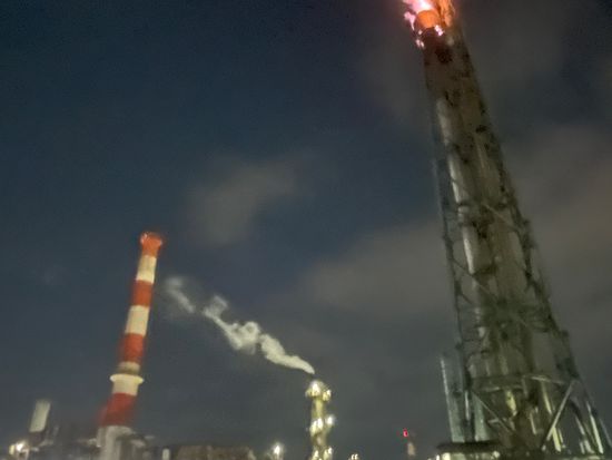 風が強かったのですが、そのおかげか、工場の煙突から噴き上がる炎の迫力と言ったら!その熱、音、匂い、これらは海の上からだこそ体験できることなのです。