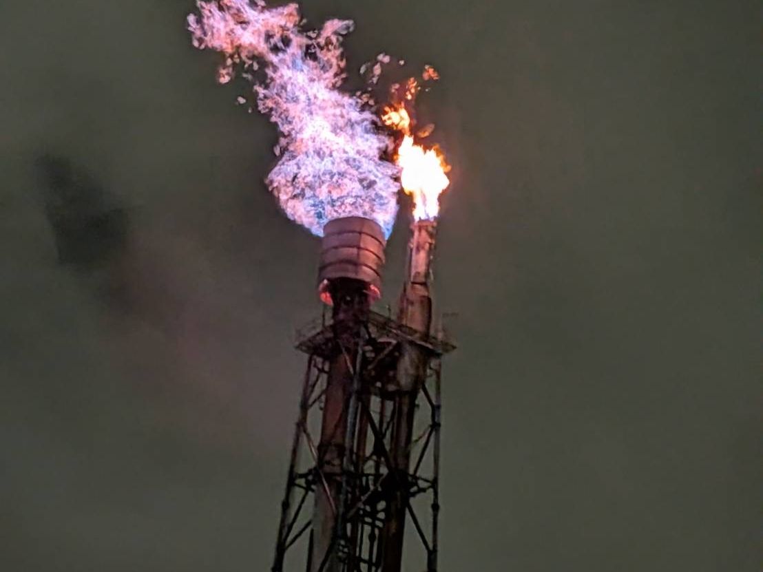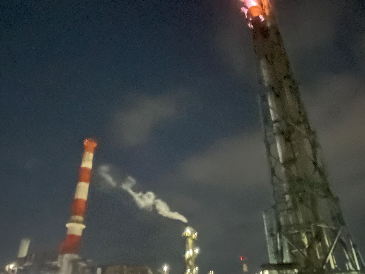 風が強かったのですが、そのおかげか、工場の煙突から噴き上がる炎の迫力と言ったら!その熱、音、匂い、これらは海の上からだこそ体験できることなのです。