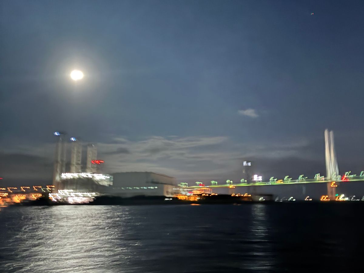 出航時はまだ日が沈む前だったので、普段陸からは見られないところも色々見られて、だんだん暗くなってくる頃に工場夜景のポイントに到着。帰り道は大黒ふ頭の花火も見られ、またクルーズ中は満月に照らされている海もとても綺麗で感動しました。ガイドさんもとても分かりやすく、色々教えて頂き大満足です☆
