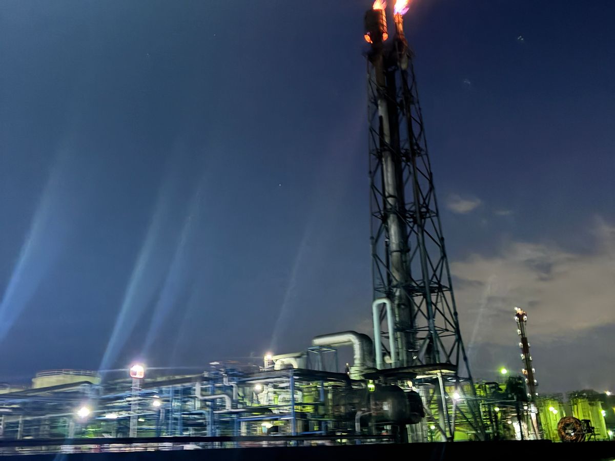 工場には詳しくないのですが、工場夜景には興味があって参加しました。かなり遠くからでも煌々と海面を照らすエネオスのフレアスタックが大迫力でした。東亜石油の紫とオレンジの二色のフレアスタックもかっこよくてその一体の工場夜景と合わせてとても美しかったです。