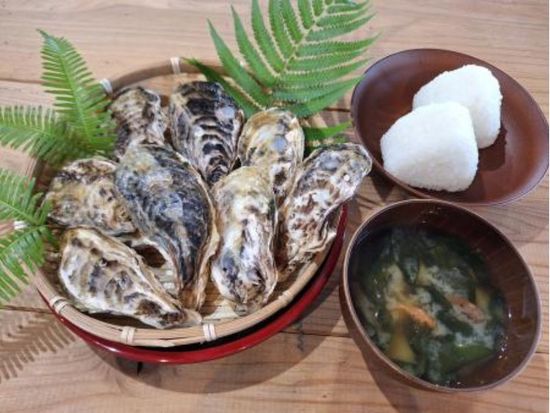 牡蠣8個、ヒオウギ貝、車エビ、カマス一夜干し、海鮮汁、おにぎり