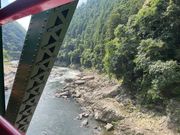 川から見える橋と電車と緑の山々