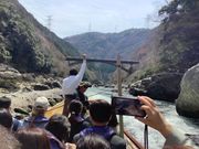 トロッコ列車は、嵯峨駅から亀岡駅までを、保津峡の渓谷美を眺めながら7.3kmの道のりです。途中、渓谷を下る船へ手を振ったりしながら、桜を楽しみました。リッチ号ではありませんでしたが、窓を開けると気持ちの良い爽快な風を感じることができました。 川下りは、亀岡から嵯峨までの16kmを山々の谷間をぬって下って行きます。今回は川の水量が少なかったようでいつもより長く舟旅を楽しむことが出来ました。船頭さんの