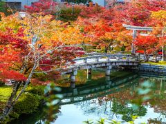 日本の紅葉名所ランキング1位の獲得実績あり!水面にカエデやイチョウが映り込む放生池は見逃せません。
