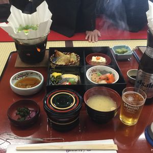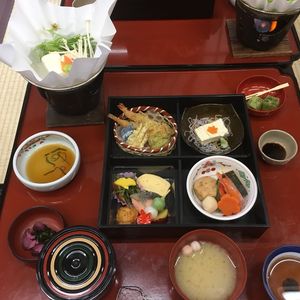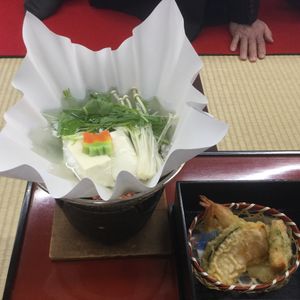 他のクチコミの通り、受付から係の方の後ろに続いてあっという間に食事場所に案内されそこで永観堂の入場券をもらい「食事が終わったらあの門から入ってください」と説明され、席に案内されました。食事は湯豆腐付きの三段重になった会席料理でした。味は悪くなく、いたって普通といったところです。