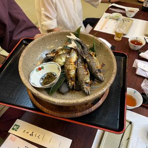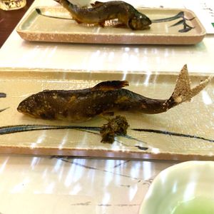 鮎の塩焼きも天ぷらも、赤だしも熱々で
