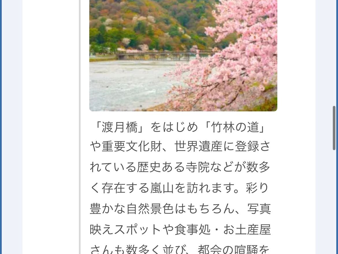 嵐山で、集合場所を間違って、ガイドさんに電話して、案内していただき、時間ギリギリになり迷惑をかけてしまいました。本当にこのツアーに参加して良かったと思いました。