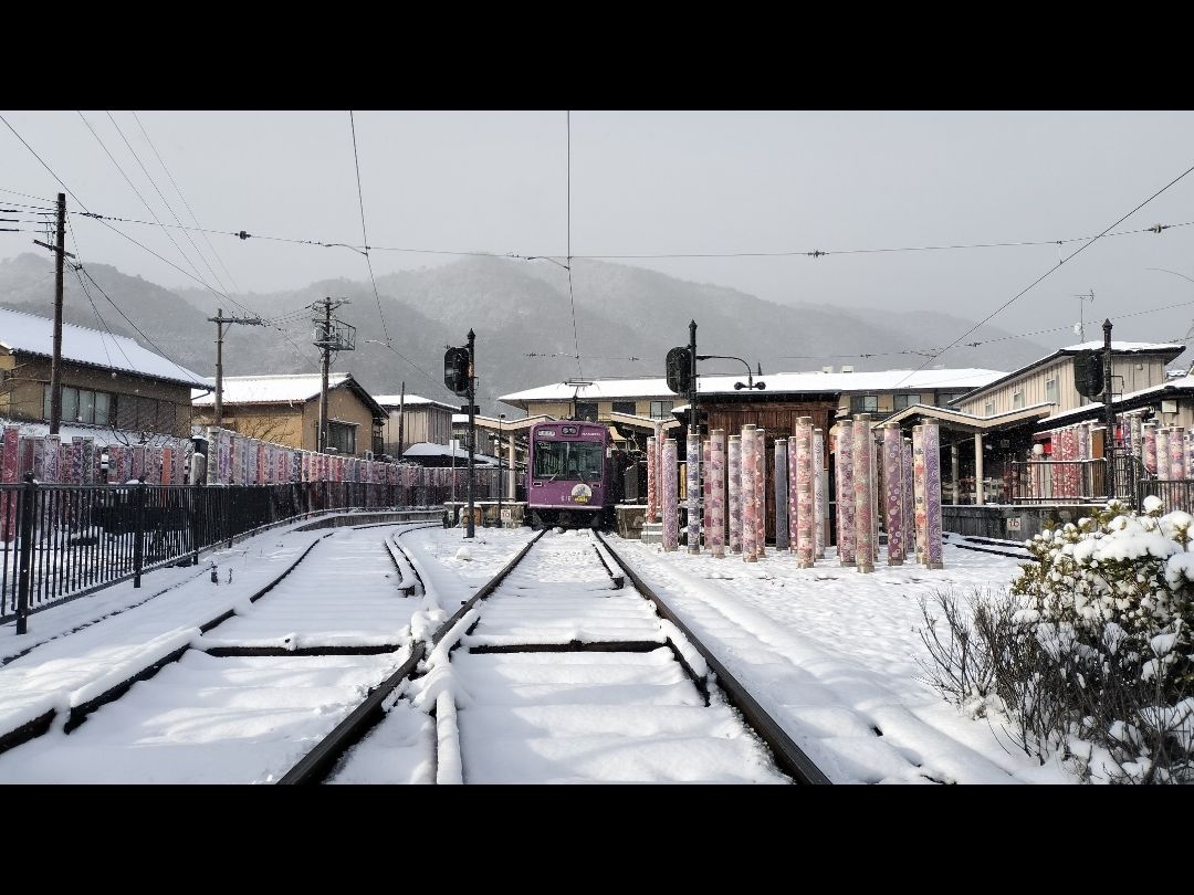 京都嵐山、嵐電沿線も雪景色。