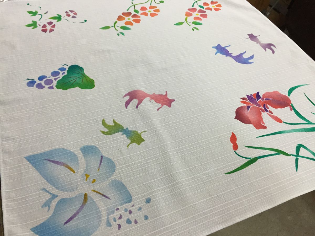友禅染はとてもたくさんの型から気に入ったものを探すことができ。絵柄は一つなど決まりも特に無いようでしたので、娘は欲張って犬とペンギンとニモ♡♡っと、好きなものを全部いれて、世界に一つしかない大満足な作品を作ることができました。