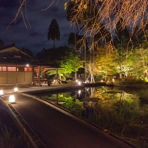 お庭はライトアップされていて、素敵でした。来週辺り桜が咲くともっと綺麗だと思います。紅葉も美しいそうです。