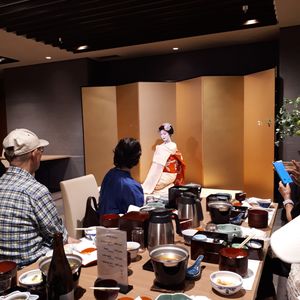 京都駅から40分くらいのしょうざんリゾートの宴会場での食事でした。料理は普通においしかったです。舞妓さんは2曲踊ってくれました。真ん前で踊ってくれたので、女5人で参加しましたが、みんな初めてみる舞妓さんの踊りに大満足でした。時間があったので質問タイムを設けてくれて、ほぼ私たちが質問していましたが、流ちょうなかわいらしい京都言葉で、上手に答えてくれて、私は踊りよりもそれが良かったです。