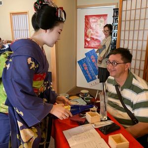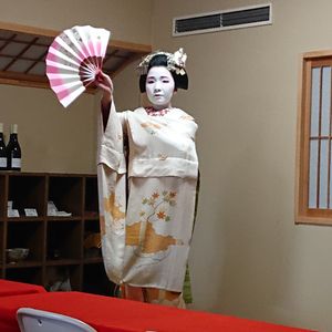 中に入ると、部屋の一方に低い「ステージ」に向かっていくつかのベンチの列があります。全員が席に着くと、舞妓が入ってきます。舞妓のための英語の通訳はとても良かったです。舞妓は自己紹介をし、彼女との写真を撮る機会があり、彼女の名前が押印された紙を受け取ることができます(もちろん日本語で)。全員が写真を撮った後、舞妓は2つの踊りを披露します。その後、質疑応答の時間があり、舞妓が飲みゲームのルールを説明します。彼女と通訳が一度ゲームをデモンストレーションし、その後舞妓は一連のボランティアに前に出て挑戦するように求めます。負けても心配しないでください。日本酒の代わりに水を飲むことを選ぶことができます!