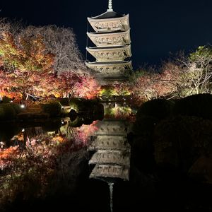 バスで現地まで連れて行ってくれるので時間の無駄が有りません。東寺に向かうまでのライトアップされた紅葉、水面に映る紅葉が素敵。歩いて行くと紅葉と東寺の景色、さらに水面にそれが映っているんです。最高の景色、これが映えるんです。