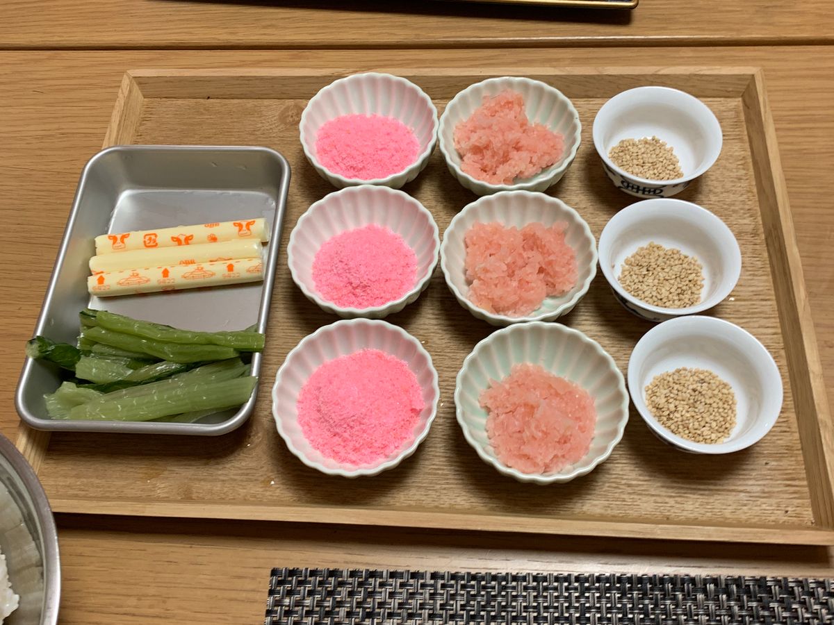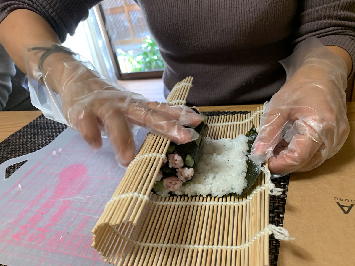 当日は具材などもご用意いただて、海苔を必要な形や枚数切るだけというとってもありがたい状況でした!ただ先生もお話されていたのですが、この準備が肝心で、具材も分量を量って全て置いておいて、海苔も切ったらどんどん作らないと海苔も湿気などでやられるので綺麗な仕上がりにならないとのこと。