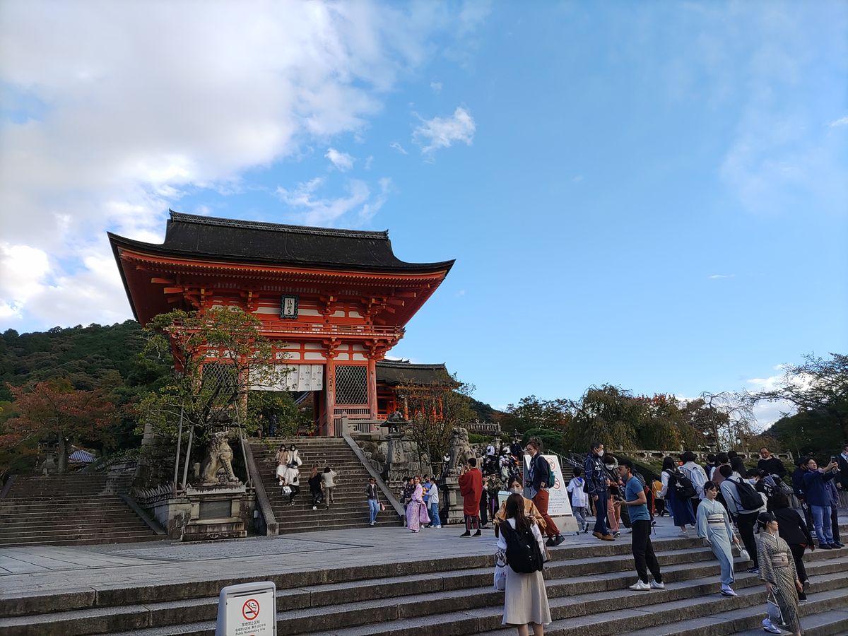 平日なので渋滞もなくバスで清水寺へ移動。私たちが到着した後に修学旅行生がたくさんきたので、混雑する前に寺社内を見ることができました。