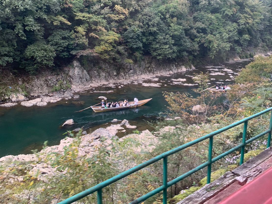亀岡から嵯峨野までの保津川の紅葉の渓谷美。どこか懐かしい木製の座席に座って、秋ならではの鮮やかな紅葉を車窓からゆっくりと見渡せました。