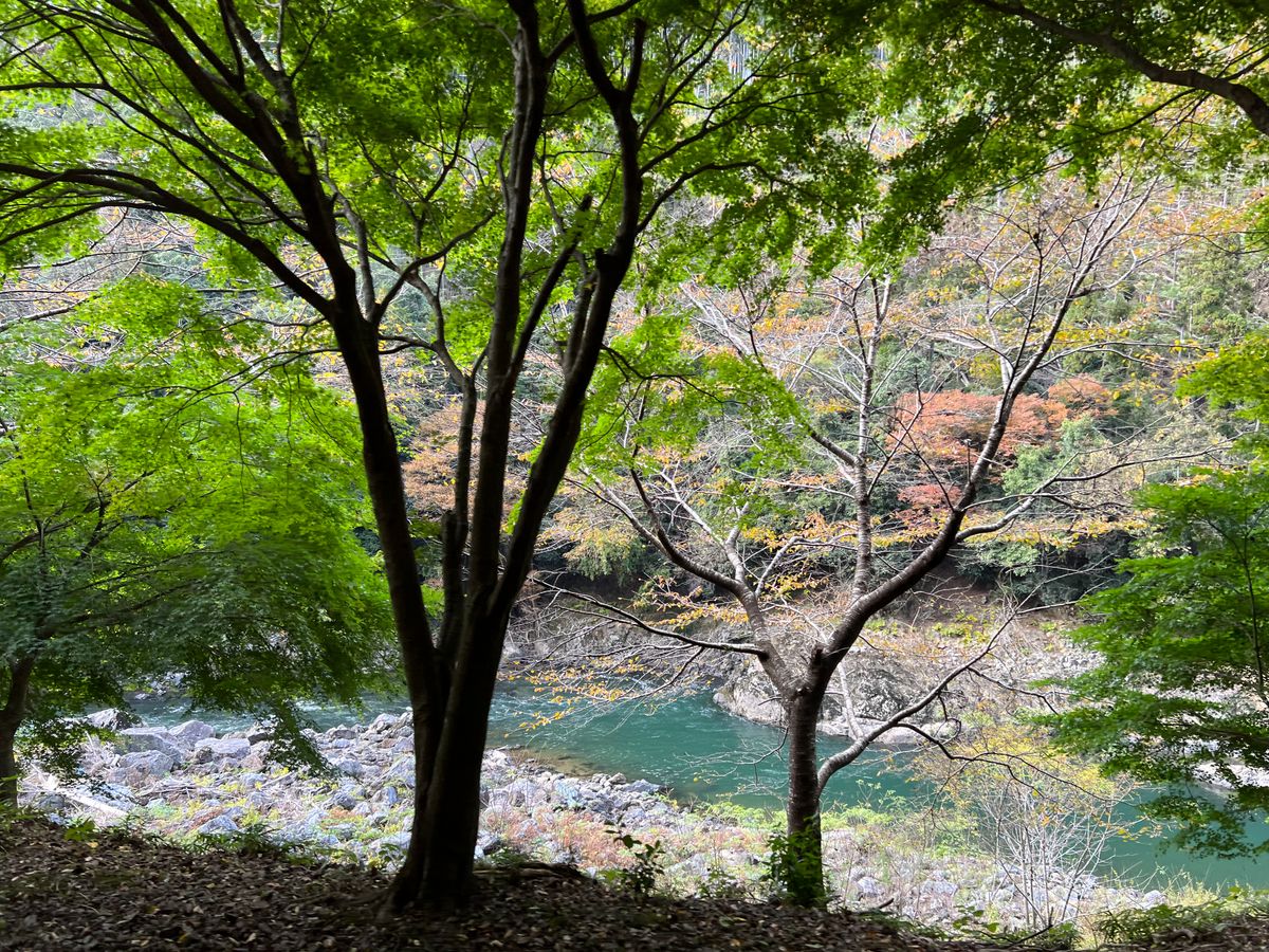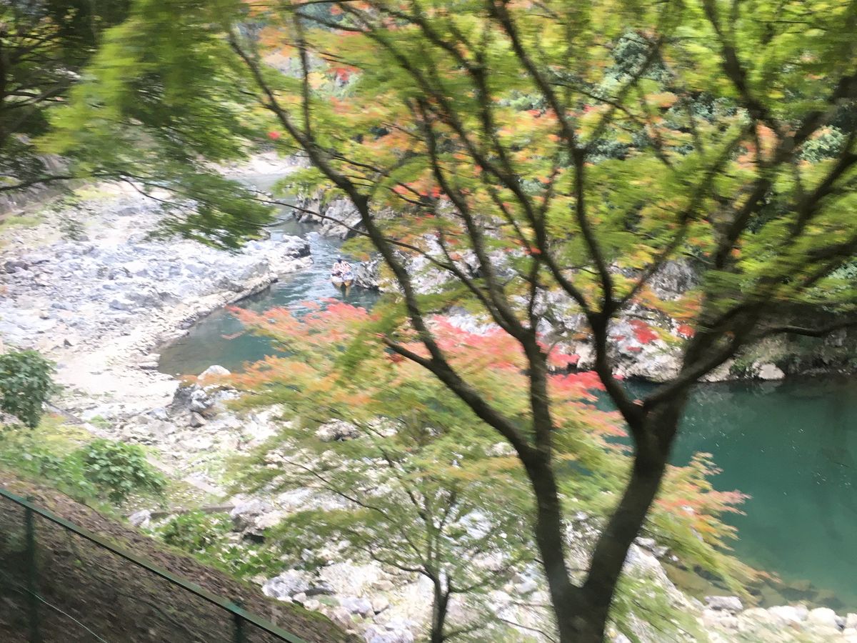 紅葉にはまだ早いですが、トロッコ列車の車窓からは少し色づいたところも見られました。亀岡駅で下車するまで風景を楽しみました。