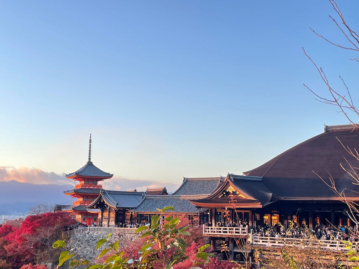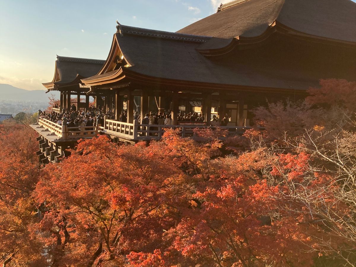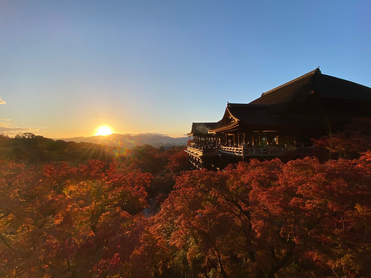 朝からあいにくの天気でしたが、その雨も移動中の間だけでバスを降りれば傘の出番は一度もなく、清水寺ではキレイな夕日まで拝むことができました。