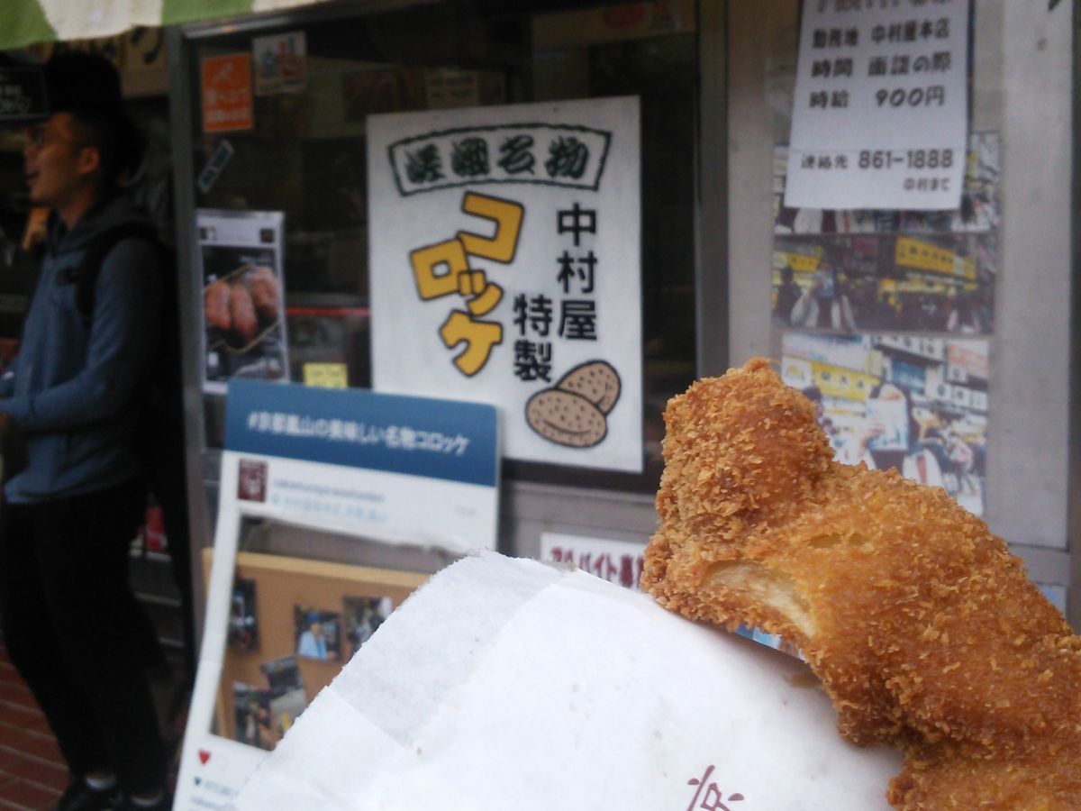 前回嵐山に来たのは十数年前、個人で、自力でまわりましたが、川下りとトロッコは回り切れず。心残りだったので今回再チャレンジ。このツアーだと効率よく、やりたいことができました。ただ一つ、時雨殿が休館日だったことはリサーチ不足でしたね。また戻ってくる口実ができてしまいました。前回もいただいて美味しかった、お肉屋さんのコロッケと串揚げ。今回もおいしくいただきました。嵐山駅からの道沿いにあり、しかし、メインエリアからはちょっと離れているため、それほど混まないお勧めのお店です。