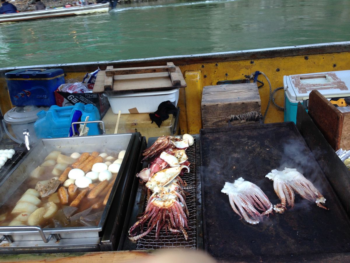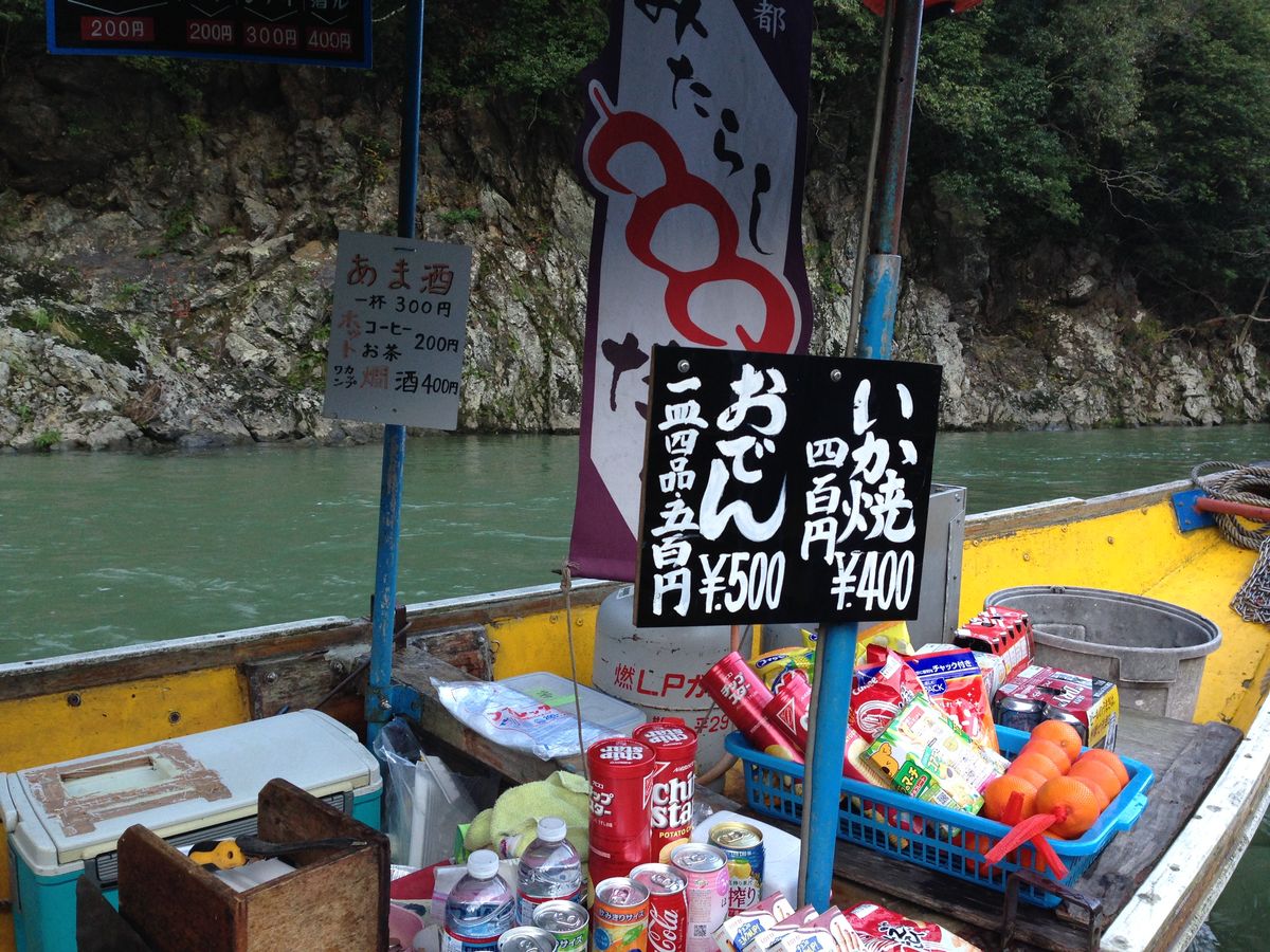長い川下りの中には緩急あり、飽きずに景色を見ながらお話を聞きながら楽しめました。嵐山到着前には熱燗やおでんを売る船が横付けして驚きです。