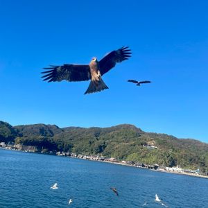天野橋立の後は、伊根湾でクルーズを楽しみました。1袋100円のかっぱえびせんで、クルーズ船からかもめにエサをあげることができます。かもめも心得たもので沢山集まってきますが、”落とし物”も降ってきます。
