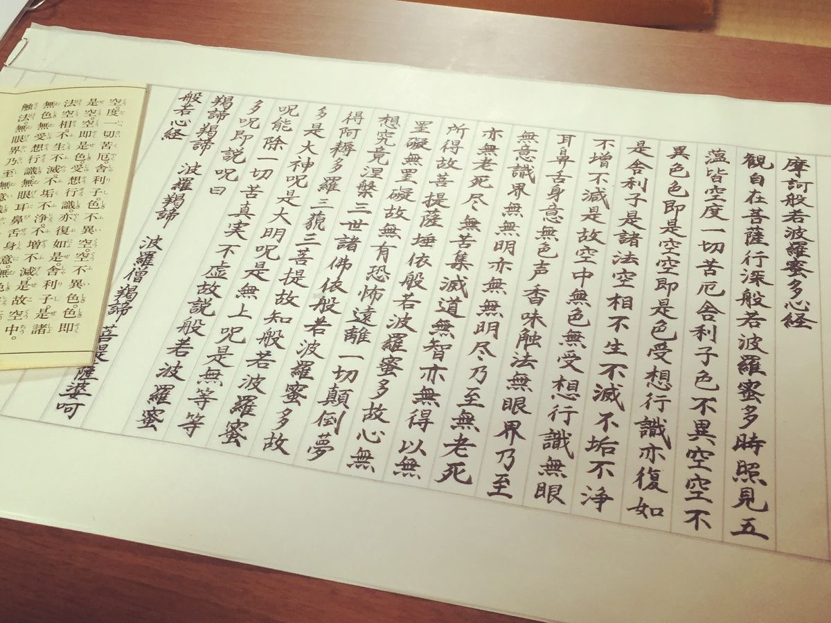 初めて般若心経の写経に取り組みました。お寺の対応が親切でした。下敷きがあるのでだれでも綺麗な字が書けます。静かなお寺で、マイペースで進めることもでき、充実したひとときでした。