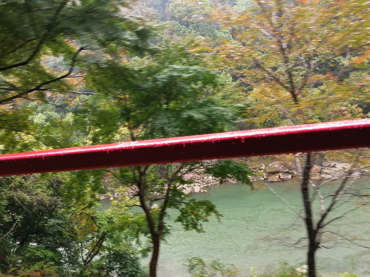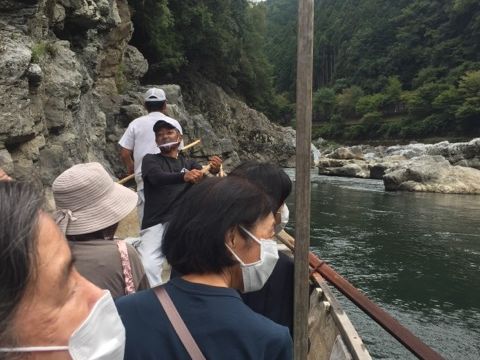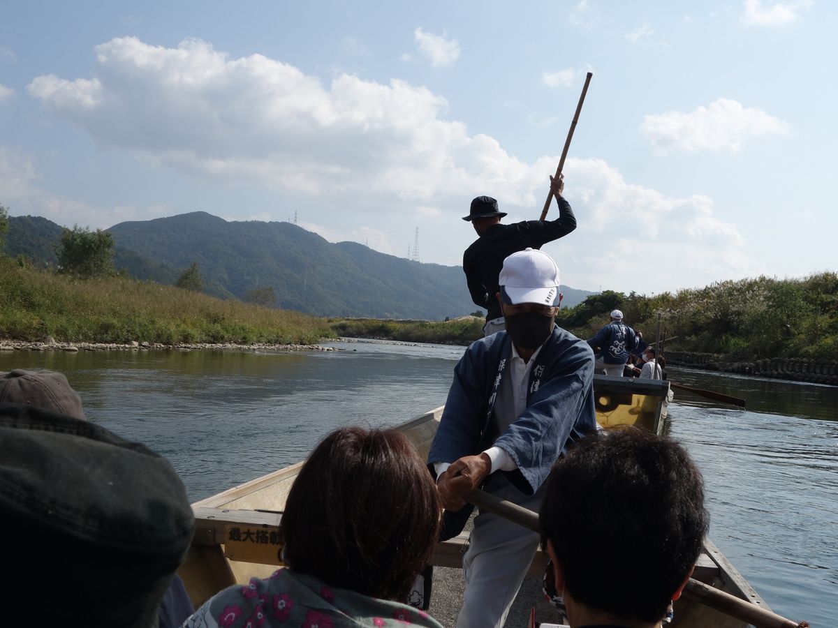 2020.9.26、トロッコ列車と保津川下りのツアーに参加しました。前日は、豪雨で参加者は4名で、川下りは中止ということで心配しましたが、当日は水量も豊富で楽しいツアーでした。いつもは3人の船頭さんが乗り込むそうですが、この日は4人。皆、楽しい話題を提供してくださり、面白かったです。 筋肉もりもりの船頭さんが漕いでくれる様子や竿さばき、そしてかじ取り、若干のスリルも格別でした。400年前から続いている川下り、京都の歴史も感じられました。