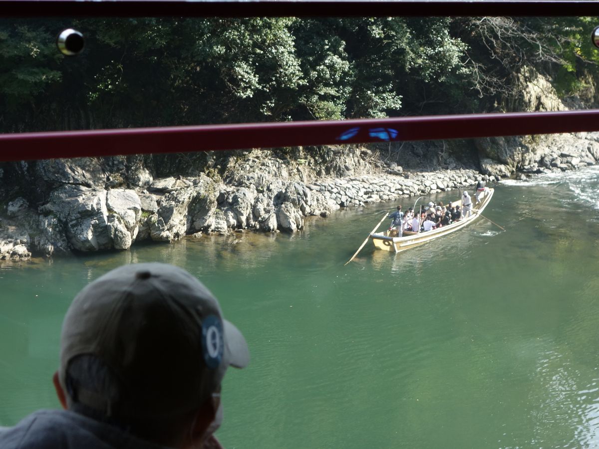 一人での参加でしたので、少し心配でしたが、全く問題無く楽しめました。まずはトロッコ電車ですが、待ち時間も無くすぐに乗れました。私の席が通路側だったので、残念だな〜〜って思ってたら、ガイドさんが電車が発車したら自由に空いてる席に座って良いですから!って言ってくれて、皆さん自由に右に左にと席を移動していました。川下りは、船頭さんの楽しい話を聞きなか約1時間20分ぐらいです。川の水量で時間が変わるみたいです。嵐山に近くなったら、舟が寄って来て、イカ焼き、甘酒や団子、飲み物などなどを、横付けして売りに来てくれます。お昼前ぐらいなので、食べたくなりますね〜〜 下船したら約2時間の自由時間がありますが、皆さん昼食を食べる方や神社仏閣を回られる方色々でした。ガイドさんが非常に話し方が上手で、今まで色々ガイドさんを見て来ましたが、トップクラスでした。