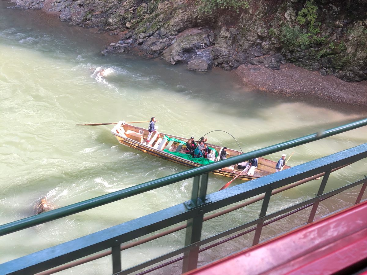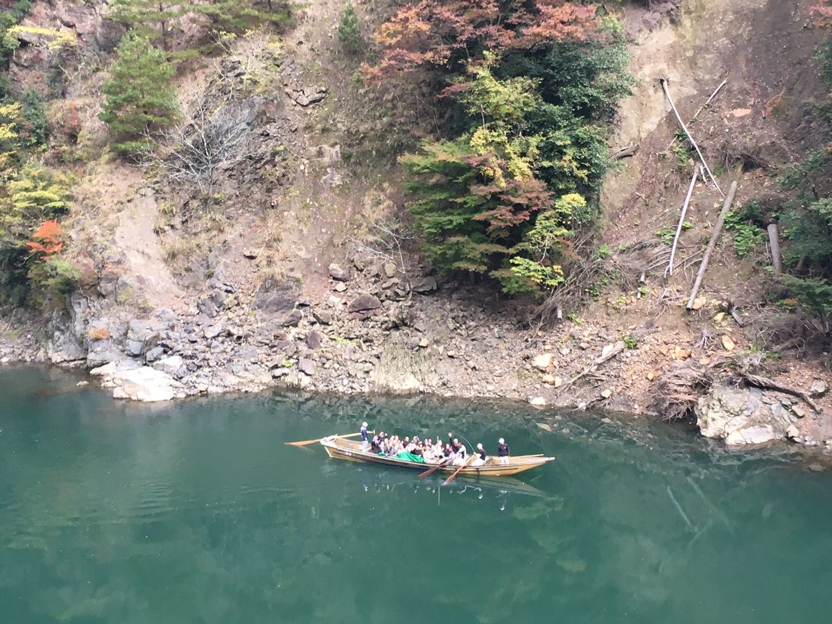 保津川下りは、少しお天気が悪かったですが、カワセミ、アオサギ、カモ、カワウなどの鳥もたくさんいて、イタチも見かけました。船頭さんが全部人力で漕いでくださって、大変なんだよ、とユーモラスにぶちぶち文句を言いながらも楽しいお話やパフォーマンスをしてくださって、ところどころ急流では結構しぶきが上がって、皆きゃあきゃあはしゃぎながら楽しく過ごしました。