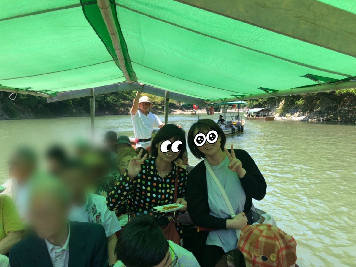時折雨がぱらつくお天気でしたが、無事にトロッコ列車にも乗れ川下りも予定通りできました。トロッコ列車から川下りの舟を何艘か見て、余計に期待感が高まった気がします。3人の船頭さんが持ち場を交代しながら軽快なトークと巧な舵取りで、たまに水しぶきを受け数か所の難所?のスリルを味わいながらも安心して乗ることができました。