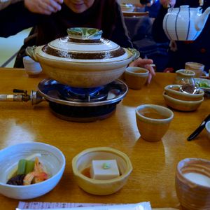『順正』では、待ち客を横目に、奥の綺麗な庭園を通り すぐ案内され、食事もスタンバイされてました。温かいものは ちゃんと温かく、いろんなお料理が少しずつきれいに盛られ(もちろん湯豆腐がメインでした)、美味しくいただきました。