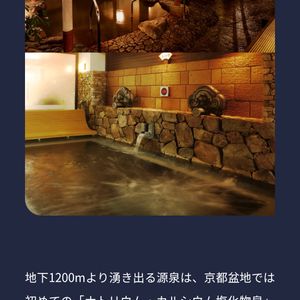 地下1200mより湧き出る源泉は、京都盆地では初めての「ナトリウム・カルシウム塩化物泉」であり、海から離れている温泉には珍しく海水に近い高濃度の泉質が確認されております。なお当温泉には、療養泉とされる温泉の基準値の9倍にあたる塩素イオン濃度が確認されており、各種効能を持っている療養温泉となっております。一般的に温泉とは、温泉法に伴い必須物質19種の成分の中から1種以上含まれているか、溶在物質が規定量以上含まれているもの、または25度以上の鉱水・温水のことを言います。天山の湯(源泉)には必須物質6種類が溶け込んでいる天然温泉です。