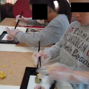 中に入ると、テーブルに練り切り2個の手本が置いてあり、スタッフの方の説明を聞きながら見本と同じように作りました。説明は丁寧で楽しく作ることができました。