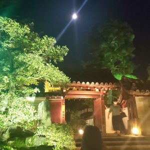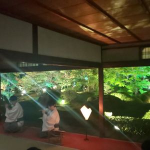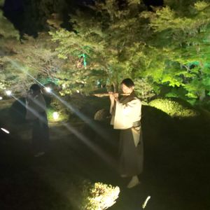 しかし、一文字写経、悟りの間でのお茶の体験はとても思い出ぶかいものとなりました。そして何より最高だったのはライトアップされたお庭で演奏される篠笛、時おり聞こえてくる虫の音はほんとうに趣深く平安絵巻の中のお月見の世界のようでした。