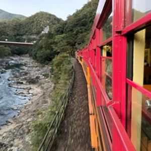 京都駅に集合し、貸切バスでトロッコ列車の駅に向かいます。トロッコ列車の先はバスの中でくじ引きだったのが笑えましたが、公平でよかったです。