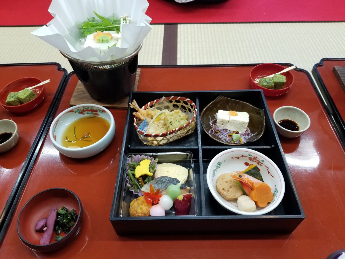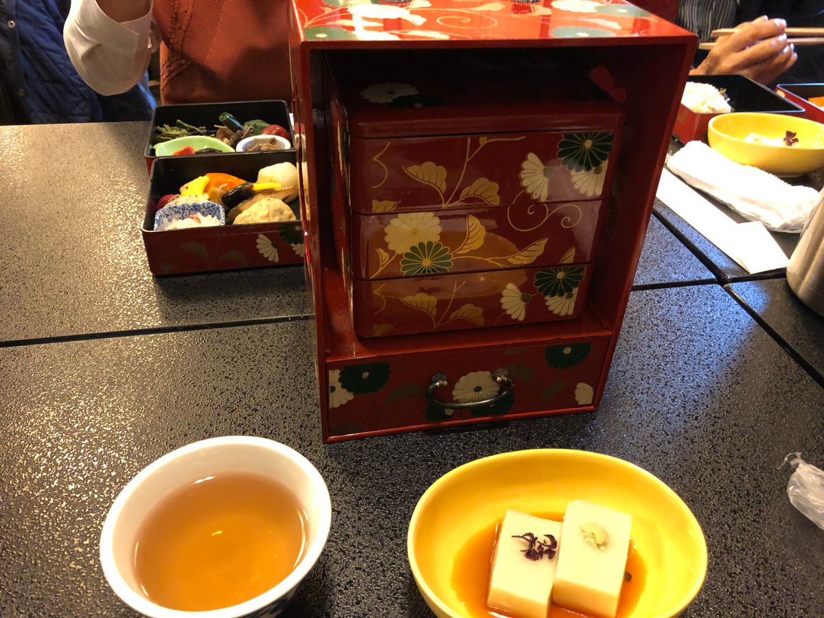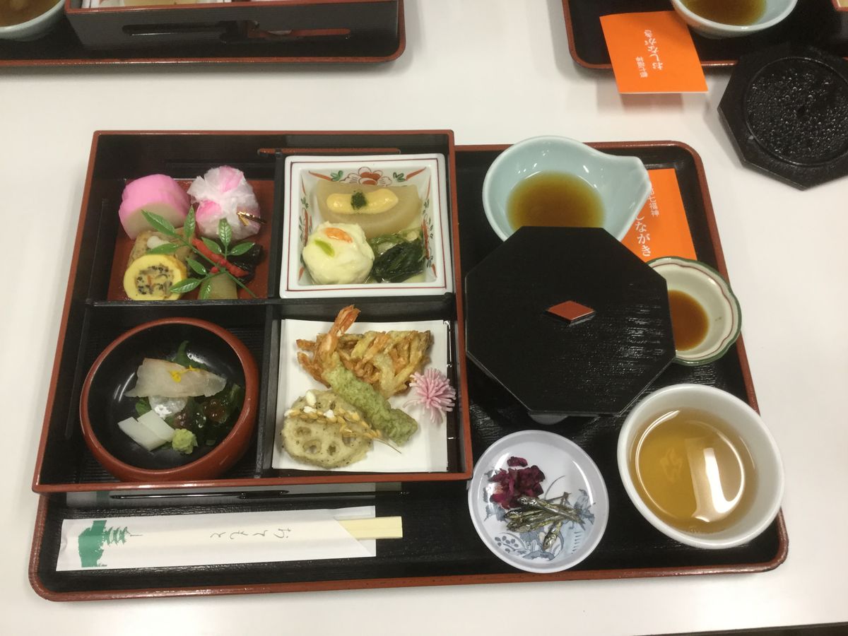 12:30の昼食開始回の予約でしたが、交通事情で到着が大幅に遅れ、13:30頃に到着しましたが、係の人が集合場所で待っていてくださって問題なくお食事を頂けました。目にも舌にも美味しいお膳でした。ただ、お座敷にお膳のスタイルなので、脚があまり曲がらない自分はちょっと座りずらく感じました。