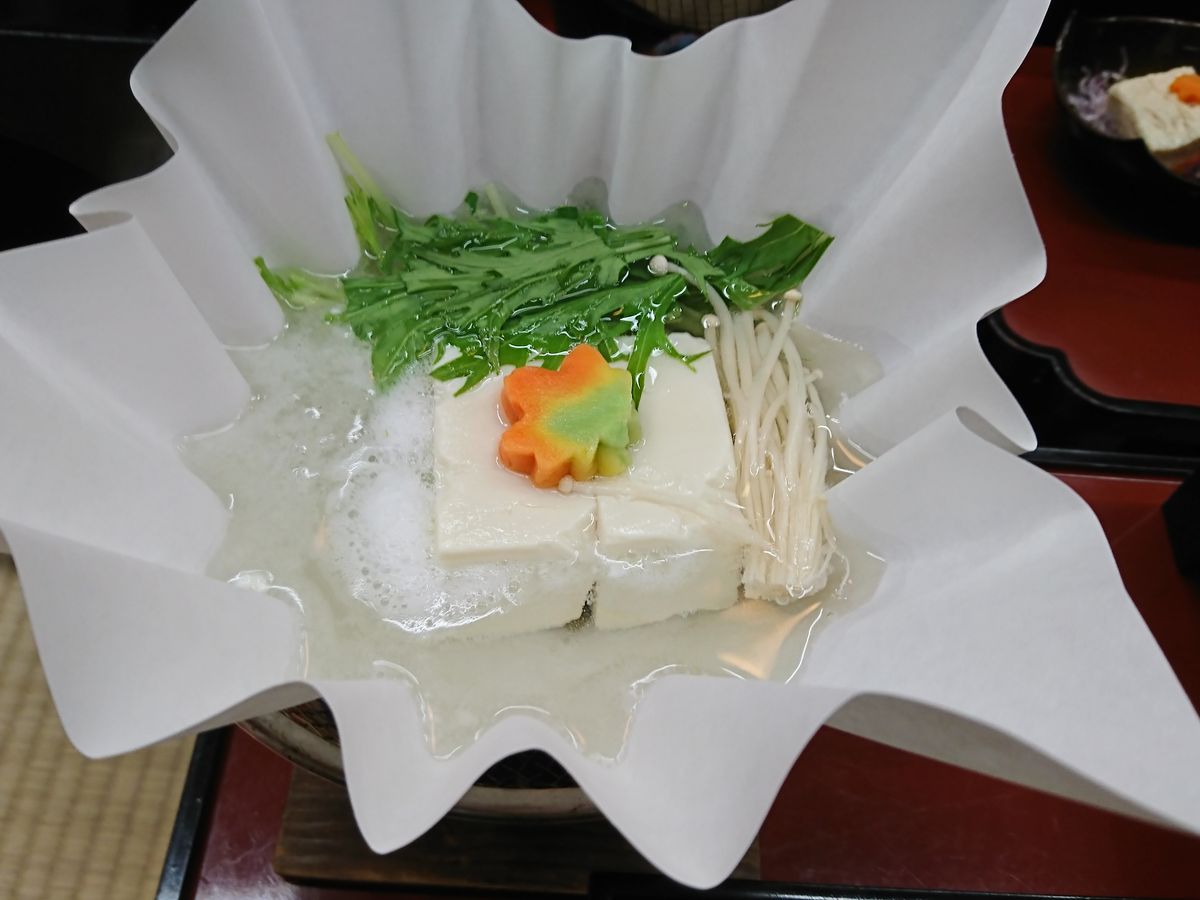 『順正』では、待ち客を横目に、奥の綺麗な庭園を通り すぐ案内され、食事もスタンバイされてました。温かいものは ちゃんと温かく、いろんなお料理が少しずつきれいに盛られ(もちろん湯豆腐がメインでした)、美味しくいただきました。