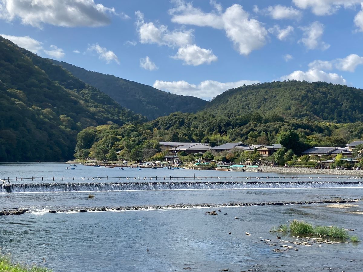 専用のバスに乗りガイドさんのお話しを聞きながらバスを一緒に降り嵐山駅に着いてほんの少し待ち、ガイドさんと指定されたトロッコ列車に乗りました。まだ紅葉ではありませんでしたが窓の無い列車が気持ちよかったです。日影は24℃くらいでした。薄いカーディガンを着ていましたが寒いくらいに感じました。途中で写真を撮ってもらい思い出にしてもらいました。ベタですがいい思い出です。そして保津川下りの乗船場へ乗り継ぎバスで行きました。10分か15分くらいでした。乗船場につき15分くらい待ったらいよいよ乗船でした。救命胴衣を着ました。船頭さんのお話しが楽しかったです。雨があまり降っておらず水位が無かったので端っこに座りましたが濡れることはなかったです。カッパを持っていきましたが不用でした。二時間があっという間でした。下船したら嵐山の駅周辺をぶらぶらしてかわいいたい焼きや抹茶スイーツを食べて竹林の道?へ行きここもあっという間に自由時間の二時間がすぎてしまいました。