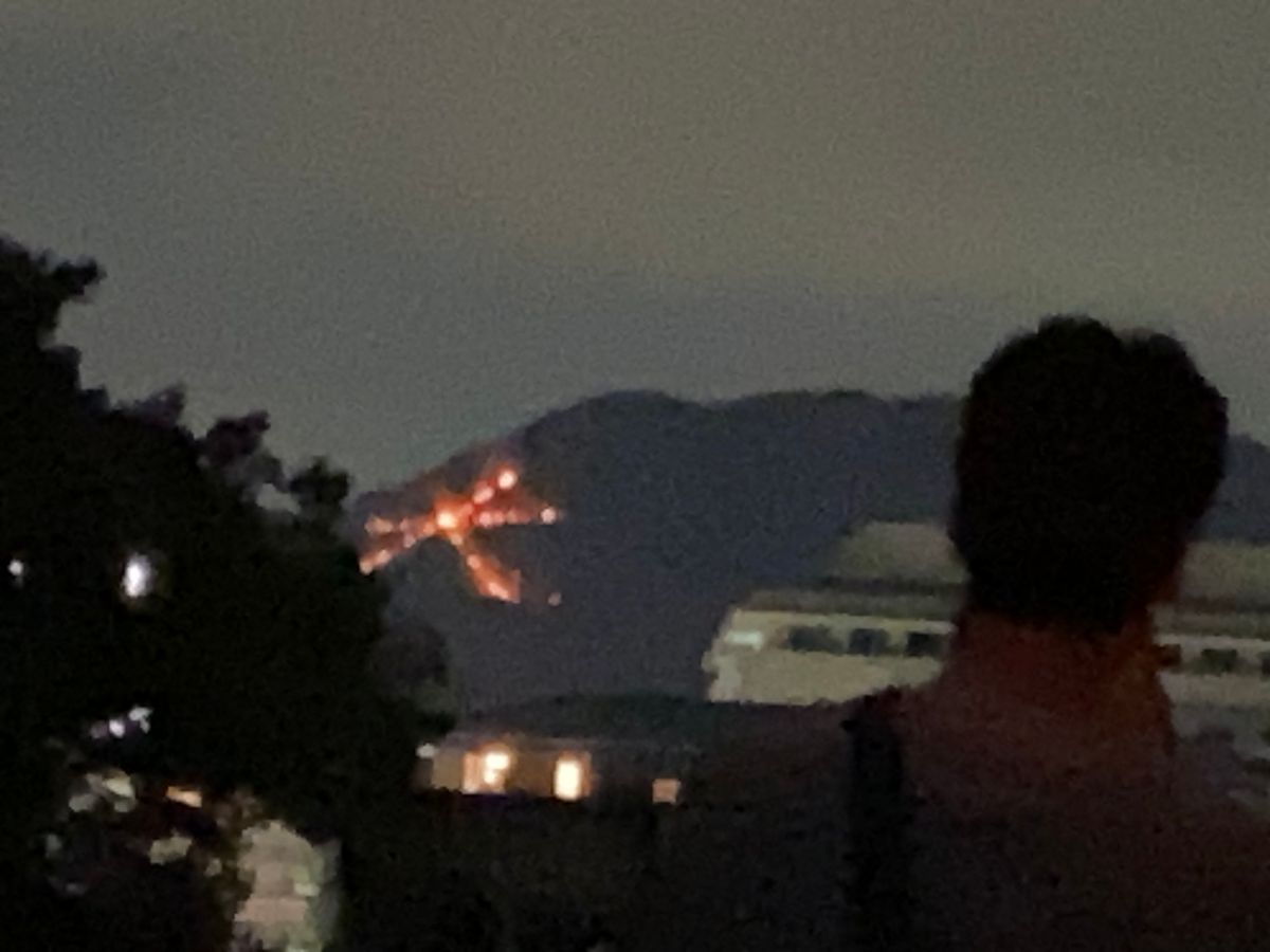 しかしMKタクシーさんが京都の街をあの大渋滞をかわしながら果敢に長年の経験から見つけた抜け道を駆使して1分1秒でも早く、見えそうな場所へ、、と走り回ってくれた姿に感動。もはや「五山送り火鑑賞ツアー」というより、MKタクシーさんのこんな道を通るの⁉️と言う様な。ジェントルだけど華麗な運転テクニックを楽しむ時間だった。最初からかなり無理のある企画だとは思ったがあの「松明1本でも見れた判定」には❓が残る。送り火なんだから、1本でも灯ってりゃ「(文字や形に見えなくても)見えたよね」と言う理屈なんでしょうが、その辺りははっきりと最初から明記すべき。後出しはズルい、詐欺にあったみたい。特に関東からこれを観に来てた方達、怒っていました。何これ?て。