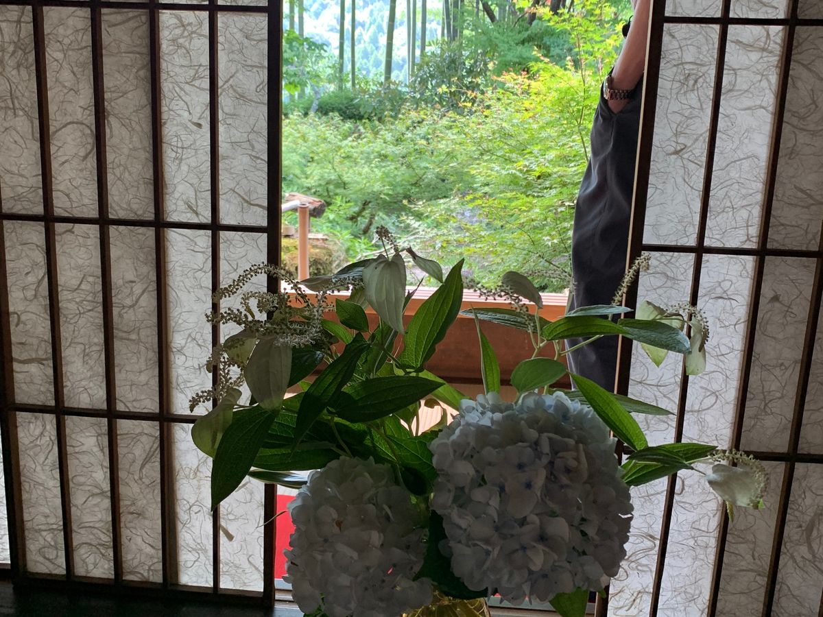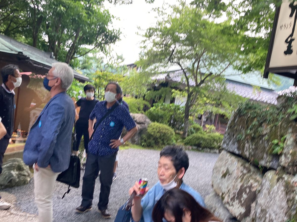 比叡山と大原、1日で行けちゃう楽ちんツアーでした。京都はしばしば訪れていますが、比叡山と大原、貴船、高雄はちょっと遠いので、足が遠ざかっていました。それがバスに乗っているだけで比叡山と大原を1日で回れちゃう。比叡山ドライブウエイからは琵琶湖の眺めが素晴らしく、観光船ミシガンも手に取るように眺められました。延暦寺根本中堂は修理中。かえって屋根の葺き替えの様子も見られて貴重な経験でした。お坊さんの説明も分かりやすく、根本中堂様式と言われる外陣、中陣より内陣が一丈も低い意味もすんなりと胸に落ちました。不滅の法灯が灯る厳かな雰囲気はほかの寺社では得難い経験です。台風4号の影響か大原も空いていて、三千院をゆっくり拝観できました。名残りの紫陽花も素敵でした。額縁庭園で知られる宝泉院も100円引きで拝観でき、茶菓のご接待でゆっくり五葉松の老木を鑑賞しました。昼食は可愛らしい三段重ねのお重に入った三千草弁当を芹生さんでいただきます。そう印象に残る美味ではありませんが、おいしくいただきました。