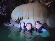 びっくりするほど透明な海をシーカヤックで鍾乳洞へ向かい、小さな入り口を潜ると神秘的で不思議な鍾乳洞の中。 鍾乳石を登り、奥へ奥へと登ると異世界へ。神聖な洞窟内では湧水で身を清め願い事を。最後はパンプキン鍾乳石の上から願掛けダイブ! 満潮迫る時間の中でしたが、ナオキジムナーはじめ、ガイドの皆さんの手際と判断で安心してスリルとワクワク感満載の冒険ツアーを満喫できました。撮ってくださった写真もステキなシ