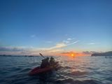 ゆるやかな流れに乗り海へ出ると、オレンジ色の太陽が沈みかけてました。海の波に揺られる事15分位かな?空のオレンジ色が濃くなり水平線に太陽が潜っていきました。濃い酸素、鮮やかな色、水平線の景色、デトックスな時間でした。帰りも覚悟していた程はキツくなく、程よいエクササイズとなりました。
